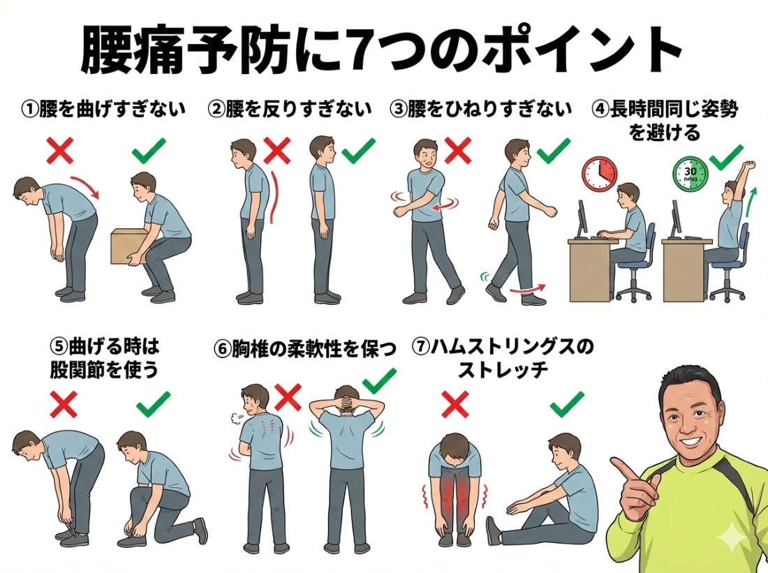 これらの7つのポイントを日常生活で意識することで、腰痛のリスクを大幅に減らすことができます。