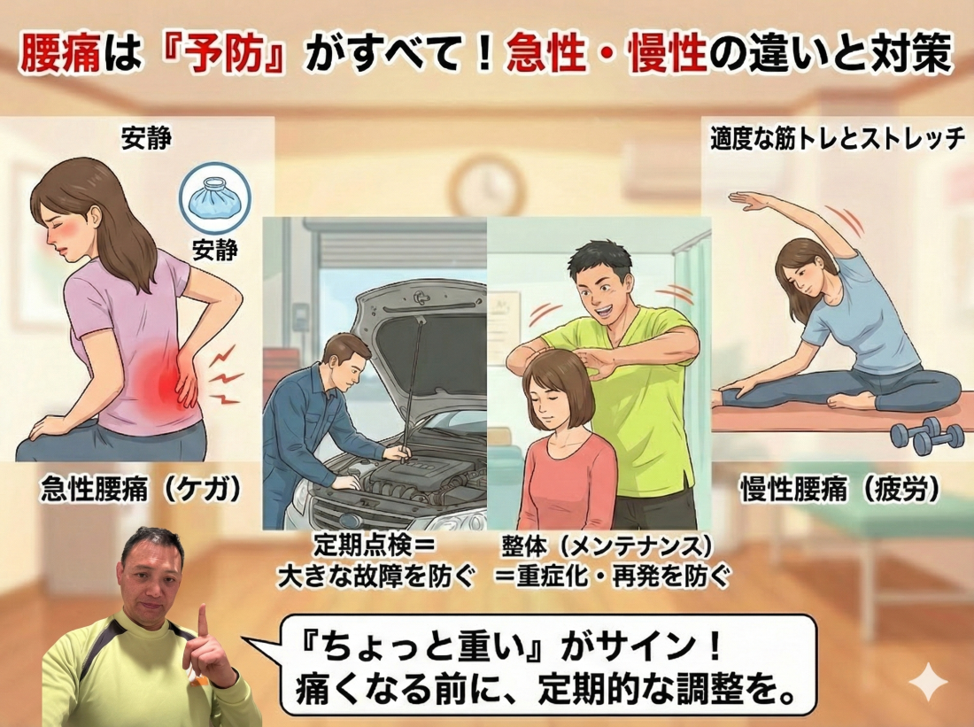 体も同じです。「ちょっと腰が重いな」という段階で調整すれば、短期間で改善します。