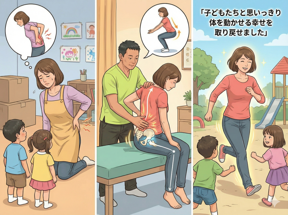 週2回の施術を1ヶ月継続し、職場での動作指導を実施。徐々にしゃがむ動作が楽になり、2ヶ月後には1日働いても腰の痛みが出なくなりました。