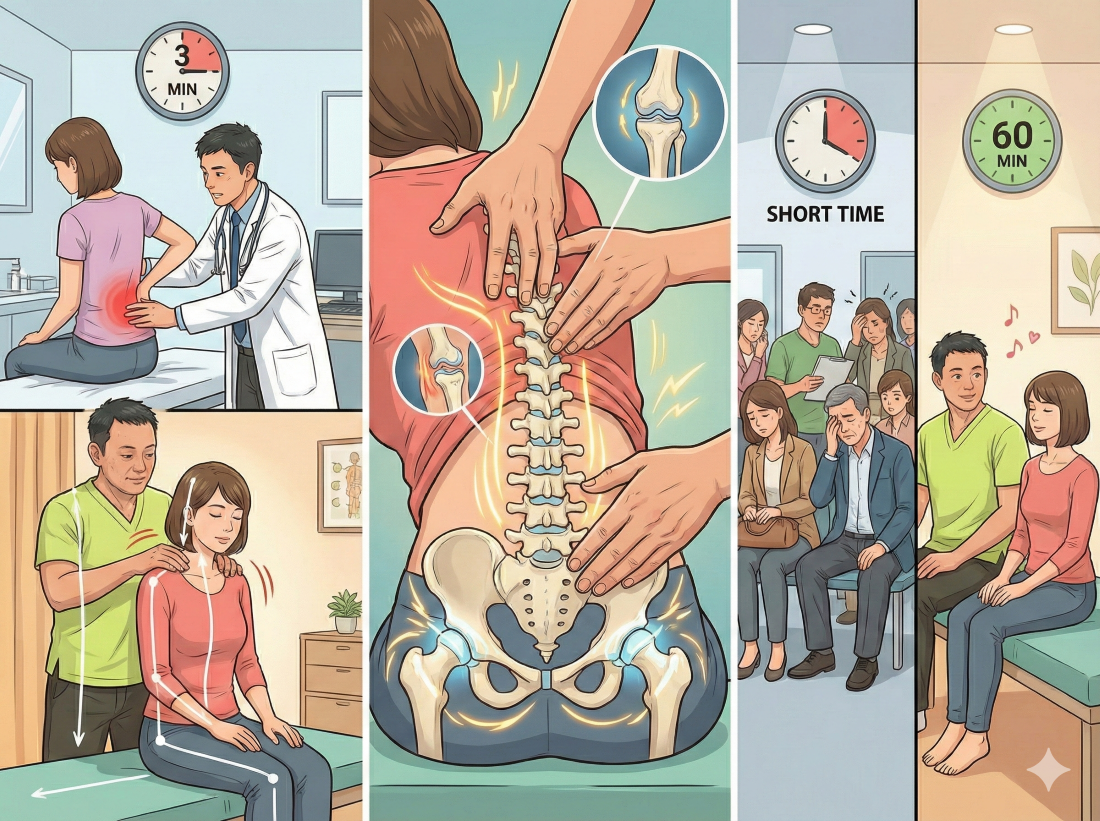 しかし残念ながら、現代医療では1人の診療時間が3分と、先生から見てもらえるのは腰だけになると思います。