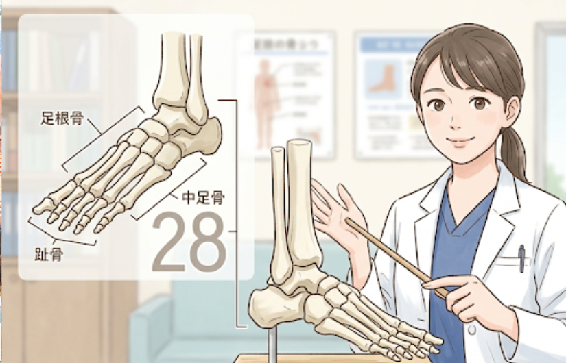 足の構造は非常に複雑です。片足には28個の骨があり、両足では56個。全身には約200を超える関節がありますが、そのうち約4分の1が足部に集中しています。これほど多くの骨と関節が密集している部位は、身体の中でも足だけです。