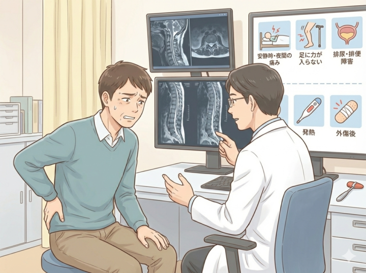 まず、安静時や夜間にも強い痛みが続く場合は、内臓疾患や腫瘍性病変の可能性があります。また、下肢の著明な筋力低下や排尿・排便障害を伴う場合は、馬尾症候群など緊急性の高い神経障害が疑われます。